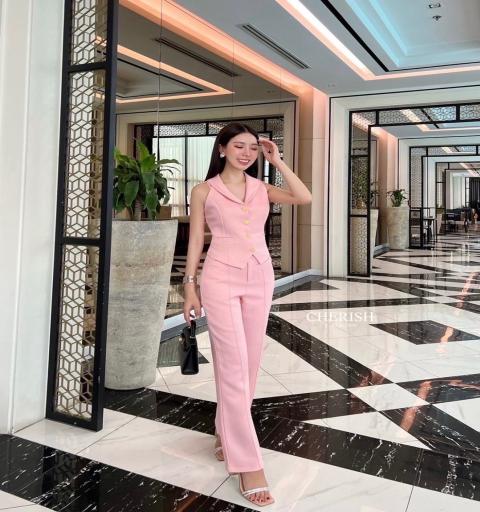 เซ็ทครอบแขนกุดผ้าทวิต ตกแต่งกระดุมสวยดูแพงมาพร้อมกับกางเกงขายาว