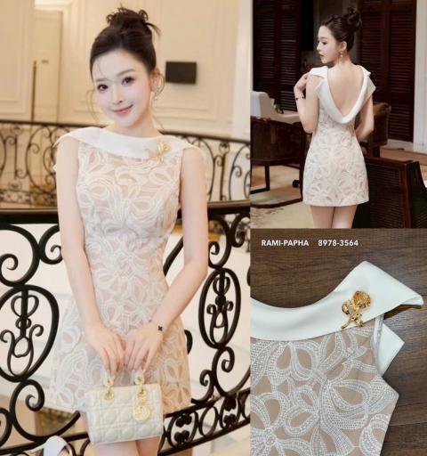 ⚜️Ready to shipping ⚜️Label :: RAMI-PAPHA(รมิปภา) เดรสสไตล์สาวเวียด โทนสีสวยหรูโดดเด่น ดีเทลตัดแต่งผ้าสีขาว ดีเทลด้านหลังเว้าเปิดสวยหรู อกมีฟองน้ำจัดทรงสวย ซับในอย่างดีทั้งตัว ซิปข้างด้านขวา ++เข็มกลัดดอกไม้อะไหล่สีทอง สวยหรูโดดเด่น