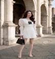 เดรสแขนยาวซีทรูทรงบอลลูลสีขาวตัวสั้น แต่งโบว์สีดำคู่หน้า
