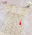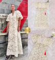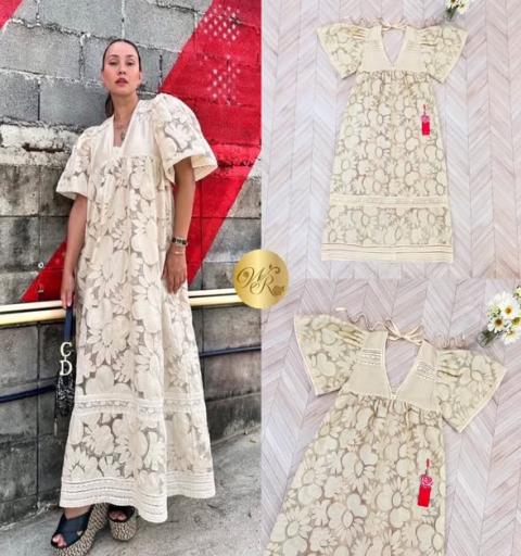 แม็กซี่เดรสทรงปล่อย ตัวยาว คอวี แขนพอง เนื้อผ้าลูกไม้โทนสีครีม