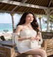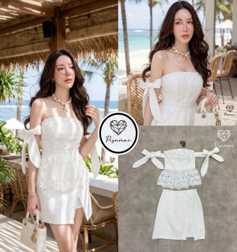 เดรสเกาะอกสีขาวแขนโบว์งานลูกไม้ฉลุ มาคู่กับกระโปรงสอบตัวสั้นสีขาว