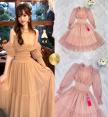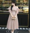 เดรสแขนยาว เว้าไหล่ ปลายแขนสม็อค เอวสม็อค ช่วงกระโปรงทรงบาน