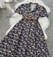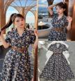เดรสยีนส์คอปกแขนสั้นตัวยาว แต่งกระดุมด้านหน้า แต่งลายดอกทั้งชุด
