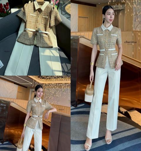 เซ็ท 3 ชิ้น เสื้อทวิตแขนสั้น + กางเกง มาพร้อมเข็มขัด สวยหรูมากกก
