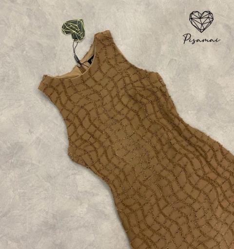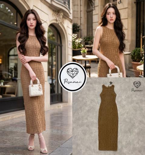 เดรสแขนกุดสีน้ำตาลตัวยาว งานทอนูนลายสี่เหลี่ยม ดีไซน์สวย