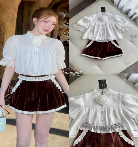 TAG :: NANNAPAT (NP)  CONCEPT :: งานต้อง Premium กำไรน้อยไม่ว่า คุณภาพ เละ เนื้อผ้าต้องดี  ♡DETAILS♡   "สวยหวานดั่งตุ๊กตาวินเทจ   เนรมิตลุคคุณหนูสายละมุน ด้วยเซ็ตแต่งดอกกุหลาบ 3D สุดเลอค่า!" วันพิเศษทั้งที ลุคต้องเป๊ะและโดดเด่นกว่าใคร! ขอแนะนำชุดเซ็ตจาก NANNAPAT รุ่นนี้ที่ผสานความหวานและความหรูหราไว้ด้วยกันแบบสิบเต็มสิบค่ะ ท่อนบนเป็นเสื้อสีขาวออฟไวท์ทรงคอตั้งระบายเบาๆ ดูผู้ดีมาก กิมมิคที่ขโมยหัวใจคือ 'ดอกกุหลาบ 3D' ขนาดใหญ่ที่คอเสื้อ(ถอดได้คะ) และกระดุมคริสตัลสุดหรู แขนเสื้อทรงตุ๊กตาพองๆ ปลายแขนตัดต่อลูกไม้ฉลุลายเพิ่มความฟรุ้งฟริ้ง แมทช์คู่มากับกางเกงขาสั้นที่ใช้เนื้อผ้า 'กำมะหยี่ (Velvet)' สีน้ำตาลเข้ม ดูแพงและมีเทกเจอร์ที่สวยเงางามยามล้อแสงไฟ ตกแต่งขอบเอวและกระเป๋าด้วยลูกไม้สีขาวเข้าเซ็ตกับตัวเสื้อแบบพอดีเป๊ะ จะใส่ไปจิบชายามบ่าย (High Tea) ดินเนอร์หรู หรือคาเฟ่สไตล์คลาสสิก ลุคนี้ก็เอาอยู่ เป็นความสวยที่มองกี่ทีก็ไม่เบื่อแน่นอนค่ะ    COLOR 》》》  NP. STANDARD SIZE  ( Size โดยประมาณนะค่ะ) S }} Bust 39"/ Waist 26"/ Hip 38" M }} Bust 41"/ Waist 28"/ Hip 40" L }} Bust 43"/ Waist 30"/ Hip 42" XL }} Bust 45"/ Waist 32"/ Hip 44" Langth }} = Shirt 18.5" / Pants 13.5"  Care Dry clean only ควรซักแห้ง หรือ ซักมือ และเลี่ยงน้ำยาซักผ้า เพื่อเป็นการถนอมผ้า และ ลดความเสียหายวัสดุตกแต่ง นะคะ  ตรวจสอบสินค้าทุกครั้งก่อนออกจากร้านนะคะ จะได้ไม่เสียเวลาคะ  เปลี่ยนคืนสินค้ามีตำหนิต้องภายใน 10 วันนะคะ ป้ายไม่ตัด ห่อเดิมนะคะ  ได้รับสินค้าแล้ว ถ่ายวีดีโอตอนแกะเช็คสินค้าทุกครั้ง เผื่อมีปัญหา จะได้ใว้ยืนยันเพื่อการเปลี่ยนคืนนะคะ |