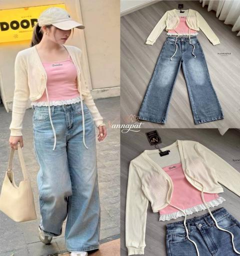 TAG :: NANNAPAT (NP)  CONCEPT :: งานต้อง Premium กำไรน้อยไม่ว่า คุณภาพ เละ เนื้อผ้าต้องดี  ♡DETAILS♡ วันไหนคิดชุดไม่ออก แต่อยากได้ลุคน่ารักๆ ถ่ายรูปขึ้นกล้อง ต้องจัดชุดเซ็ต 3 ชิ้นจาก NANNAPAT เซ็ตนี้เลยค่ะ! คุ้มสุดๆ ได้ไปเลยครบเซ็ตไม่ต้องหาแมทช์เองให้เหนื่อย ท่อนบนน่ารักขี้เล่นด้วยเสื้อสายเดี่ยวสีชมพูนมหวานๆ ชายเสื้อแต่งระบายลูกไม้สีขาวสุดคิวท์ มาพร้อมเสื้อคลุมคาร์ดิแกนไหมพรมร่องสีครีม ดีเทลเชือกผูกโบว์ด้านหน้าเพิ่มความเก๋และกันแดดกันหนาวได้เบาๆ แมทช์คู่กับกางเกงยีนส์เอวสูงทรงขากระบอกใหญ่ สียีนส์ฟอกสวยมาก ทรงกางเกงเป๊ะสุดๆ ใส่แล้วเก็บพุง พรางหุ่นให้ขาดูเรียวยาวสับๆ จะใส่ไปนั่งคาเฟ่ เดินช้อปปิ้ง หรือถ่ายรูปชิคๆ บนรถไฟฟ้าก็รอดทุกลุค แถมยังสามารถเอาแต่ละชิ้นไปแยกแมทช์กับชุดอื่นในตู้ได้อีกเพียบ คุ้มค่าที่สุดค่ะ!    COLOR 》》》  NP. STANDARD SIZE  ( Size โดยประมาณนะค่ะ) S }} Bust 29-32"/ Waist 25-26"/ Hip 36-37" M }} Bust 31-34"/ Waist 27-28"/ Hip 38-39" L }} Bust 33-36"/ Waist 29-30"/ Hip 40-41" XL }} Bust 35-38"/ Waist 31-32"/ Hip 42-43" Langth }} = Shirt 16", Crop 11" / Pants 41"  Care Dry clean only ควรซักแห้ง หรือ ซักมือ และเลี่ยงน้ำยาซักผ้า เพื่อเป็นการถนอมผ้า และ ลดความเสียหายวัสดุตกแต่ง นะคะ  ตรวจสอบสินค้าทุกครั้งก่อนออกจากร้านนะคะ จะได้ไม่เสียเวลาคะ  เปลี่ยนคืนสินค้ามีตำหนิต้องภายใน 10 วันนะคะ ป้ายไม่ตัด ห่อเดิมนะคะ  ได้รับสินค้าแล้ว ถ่ายวีดีโอตอนแกะเช็คสินค้าทุกครั้ง เผื่อมีปัญหา จะได้ใว้ยืนยันเพื่อการเปลี่ยนคืนนะคะ |