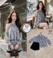 เดรสชีฟองลายกราฟฟิกผ้สเปิดหัวไหล่สีเทา มาคู่กับกางเกงขาสั้นสีดำ