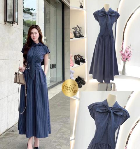 เดรสแขนกุดตัวยาวสวยชช่องคอผูกโบเก๋ ตัวชุดมาในผ้าเนื้อสวยลายริ้ว