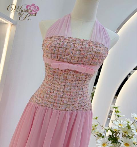 Widelia    เดรสตัวยาว สายคล้องคอ ผูกโบว์หลัง อกเย็บโบว์ ช่วงบนเนื้อผ้าทวิต  [พร้อมส่ง]