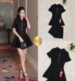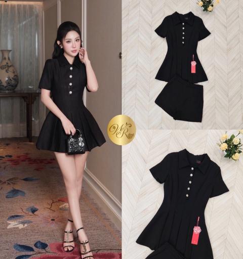 มินิเดรส+กางเกงขาสั้น ตัวเดรสคอปก แขนสั้น อกติดกระดุมเพชร ชายเดรสเย็บจีบ ซิปหลัง
