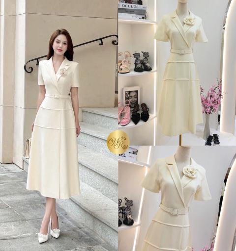 เดรสยาวตัวสวยทรงดี ตัวเดรสมาในผ้าเรียบเนื้อสวย คอปกเชิ๊ตแต่งดอกไม้สวย