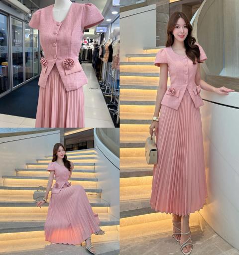 📌เซ็ท 3 ชิ้น: เสื้อ+กระโปรงพลีท+เข็มกลัดดอกไม้