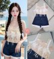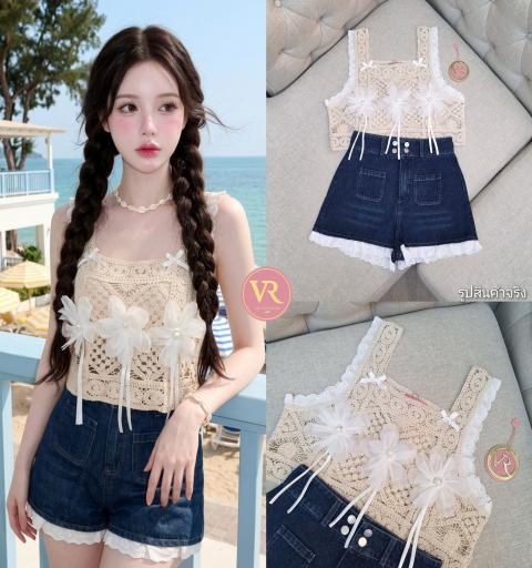 Set เสื้อถักแขนกุดตัวสั้น แต่งขอบลูกไม้ แต่งโบว์และดอกไม้D ช่วงอก ทรงoversize เล็กน้อย