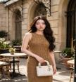 เดรสแขนกุดสีน้ำตาลตัวยาว งานทอนูนลายสี่เหลี่ยม ดีไซน์สวย