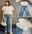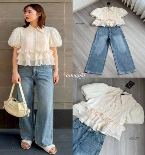 TAG :: NANNAPAT (NP)  CONCEPT :: งานต้อง Premium กำไรน้อยไม่ว่า คุณภาพ เละ เนื้อผ้าต้องดี  ♡DETAILS♡  "สวยละมุนทัชใจ!   แมทช์ลุค Casual ลูกคุณหนู ด้วยเสื้อระบายพริ้วๆ คู่ยีนส์ทรงเป๊ะ" วันหยุดนี้ใครมีแพลนไปคาเฟ่หรือเดินเล่นชิลๆ ต้องหยิบเซ็ตนี้จาก NANNAPAT มาใส่เลยค่ะ! เป็นความหวานปนเท่ที่ผสมกันได้อย่างลงตัวสุดๆ ท่อนบนเป็นเสื้อคอปกแขนพองตุ๊กตา โทนสีครีมวานิลลาละมุนตา ดีเทลแน่นมากก ทั้งงานตีเกล็ดช่วงอก ประดับกระดุมคริสตัลวิบวับ และดอกไม้ผ้า 3D สุดคิวท์ ไฮไลท์คือชายเสื้อเย็บต่อผ้าเป็นระบาย 3 ชั้น (Tiered Peplum) ทรงนี้ใส่แล้วพรางพุง ดูมีเอว แถมเนื้อผ้ายังทิ้งตัวพริ้วสวยมากค่ะ (ตัวเสื้อมีซับในให้นะคะ ใส่สวยมั่นใจเลย) แมทช์มากับกางเกงยีนส์เอวสูงทรงขากระบอกใหญ่สีบลูฟอก ทรงกางเกงคือเดอะเบสท์ ใส่แล้วขาดูเรียวยาวสับ ช่วยเบรกความหวานของท่อนบนให้ลุคดูชิค คล่องตัว และดูมีสไตล์มากขึ้น จะใส่รองเท้าผ้าใบหรือรองเท้าแตะรัดส้นก็เข้ากันไปหมดค่ะ    COLOR 》》》  NP. STANDARD SIZE  ( Size โดยประมาณนะค่ะ) S }} Bust 36"/ Waist 26"/ Hip 38" M }} Bust 38"/ Waist 28"/ Hip 40" L }} Bust 40"/ Waist 30"/ Hip 42" XL }} Bust 42"/ Waist 32"/ Hip 44" Langth }} = Shirt 20" / Pants 41"  Care Dry clean only ควรซักแห้ง หรือ ซักมือ และเลี่ยงน้ำยาซักผ้า เพื่อเป็นการถนอมผ้า และ ลดความเสียหายวัสดุตกแต่ง นะคะ  ตรวจสอบสินค้าทุกครั้งก่อนออกจากร้านนะคะ จะได้ไม่เสียเวลาคะ  เปลี่ยนคืนสินค้ามีตำหนิต้องภายใน 10 วันนะคะ ป้ายไม่ตัด ห่อเดิมนะคะ  ได้รับสินค้าแล้ว ถ่ายวีดีโอตอนแกะเช็คสินค้าทุกครั้ง เผื่อมีปัญหา จะได้ใว้ยืนยันเพื่อการเปลี่ยนคืนนะคะ |