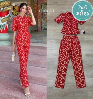 Set กี่เพ้า เสื้อลายดอกคอจีนตกแต่งกระดุมกุ๊น ตัวเสื้อเข้ารูป