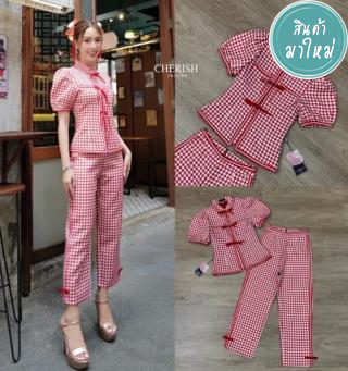 เซ็ทเสื้อคอจีนแขนตุ๊กตา แต่งขอบและโบว์กุ๊น ลายสก็อต
