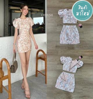 ชุดเซ็ทผ้าทอพิมพ์ลายดอก เสื้อครอปเป็นแขนตุ๊กตาตกแต่งโบว์ช่วงอกซิปหลัง