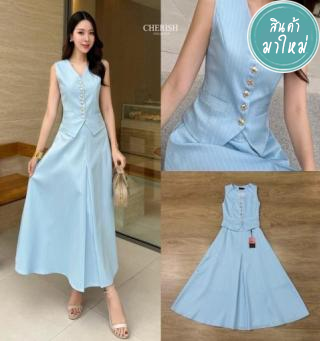 ชุดเซ็ทสุดหรู เสื้อ+กระโปรง เซ็ทนี้ ตัวเสื้อแขนกุดตัวยาวตกแต่งกระดุมพร้อมกระเป๋าใช้งานได้จริง
