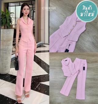 เซ็ทครอบแขนกุดผ้าทวิต ตกแต่งกระดุมสวยดูแพงมาพร้อมกับกางเกงขายาว