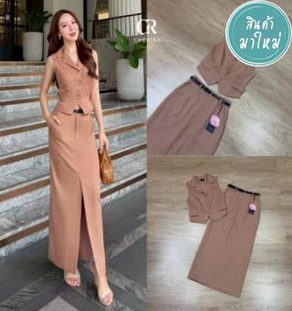 ชุดเซ็ท 3 ชิ้น เสื้อ+กระโปรง+เข็มขัด ตัวเสื้อกั๊กลายริ้ว แขนกุดคอวี
