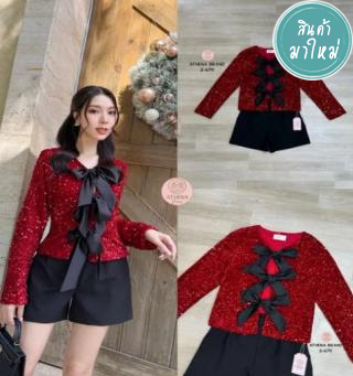 เสื้อ+กางเกง เสื้อแขนยาวดีไซน์ผูกโบว์ด้านหน้า เนื้อผ้าปักเลื่อมเนื้อนิ่ม