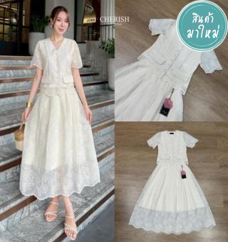 ชุดเซ็ทลูกไม้ เสื้อ+กระโปรง สุดน่ารัก ตัวเสื้อคอวีแขนสั้นฉลุลูกไม้ทั้งตัว